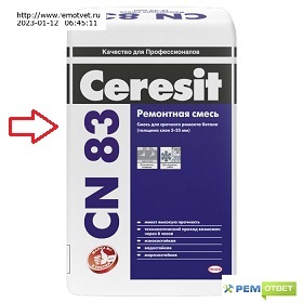 ремонтную смесь на основе цемента Ceresit CN 83, наносится на чистое основание без пыли, перед нанесением ремонтной смеси поверхность грунтуется с просушкой.