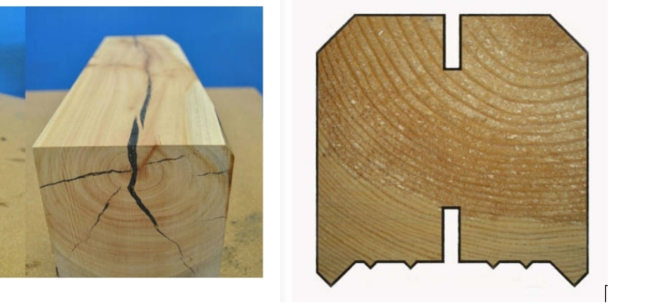 Во-третьих, нет деформационных пропилов вдоль верха и низа каждого бруса, в итоге брус закручен и растрескан. Брус и оцилиндрованное бревно при сушке могут скручиваться и трескаться, потому что в процессе распиловки/оцилиндровки порушена структура древесины, целостность годовых колец. Дикое бревно не деформируется, оно может только немного трескаться из-за потери в объеме при сушке. Пропил компенсирует деформацию и не дает ей идти дальше.
