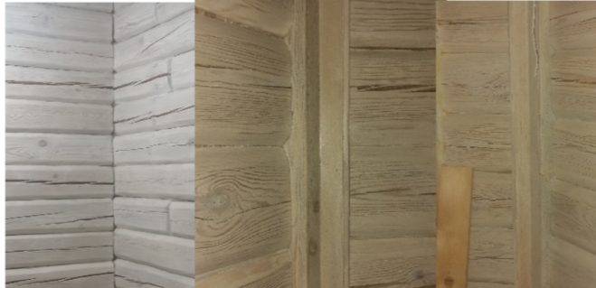 В-третьих, не сняты фаски и не остругана поверхность. Предполагалось, видимо, что стены будут обшиваться. Но ведь смысл деревянных стен заключается в их натуральности. И обшивка обходится не дешевле шлифовки-покраски-герметизации, потому что требует защиты от мышей. Заказчик сначала был полон оптимизма выполнить отделку сам, и выпиливал фаски болгаркой, а из углов выбивал стамеской. Получилось как на фото слева: