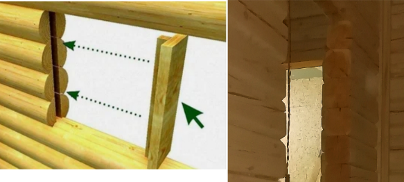 Помню, когда мы бригадой строили турбазу из дикого бревна, то сначала врезали в проемы деревянную коробку сечением 100мм на толщину стены, а в нее монтировали окна и двери. Эти коробки служили заодно окосячкой, скрепляя бревна в местах проемов, чтобы не разъезжались. Здесь я этих коробок не вижу, окосячки в межкомнатных проемах тоже нет. Ее можно сделать сейчас, но надо было во время строительства. Кое-где брус успел разъехаться.