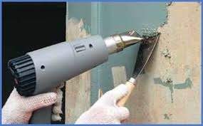Шпатель держим под небольшим углом к стене и убираем о статки набухшей от влаги, извести.
