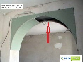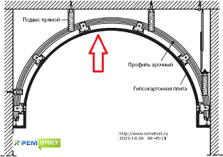 В моем случае арочный проем делался из профилей, включая арочный профиль, так же использовались подвесы и вся эта"конструкция" обшивалась гипсокартоном, вот схема для наглядности.