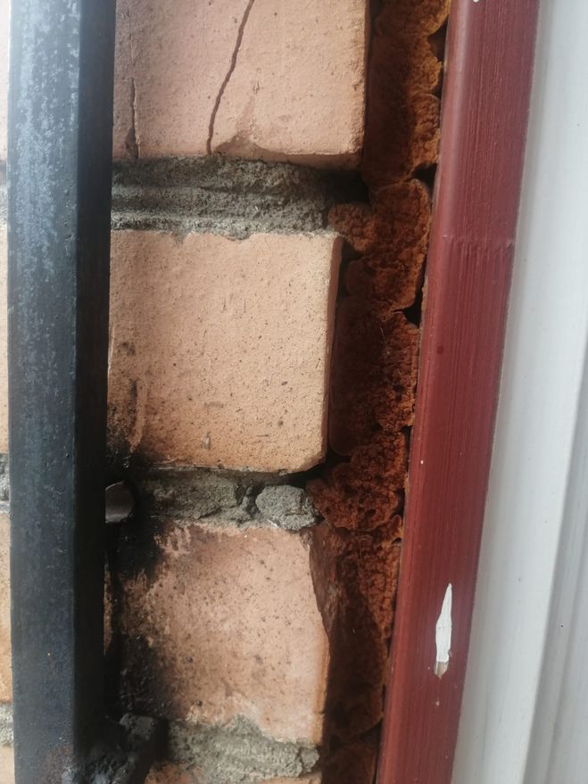 Судя по фотографии, монтажную пену не защищали от воздействия прямых солнечных лучей (УФ-излучение), то есть была допущена ошибка.
