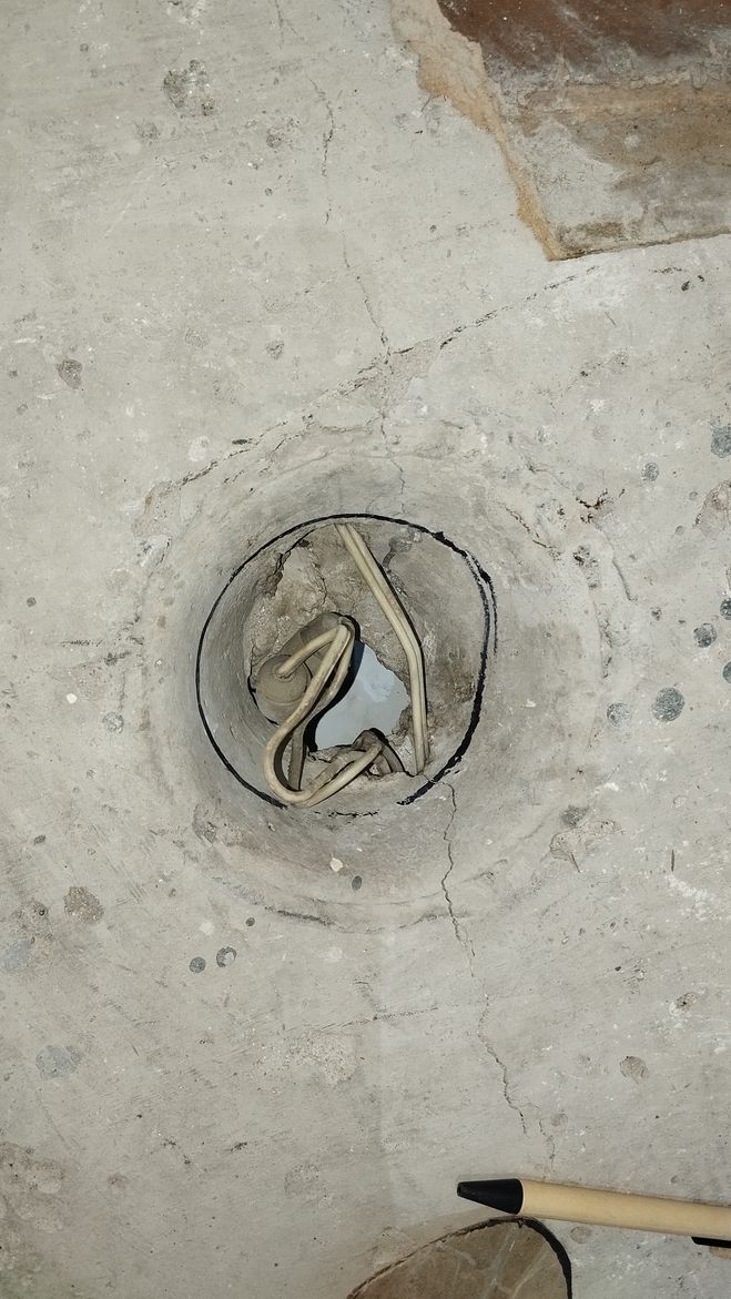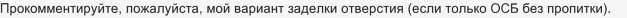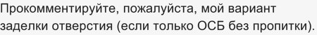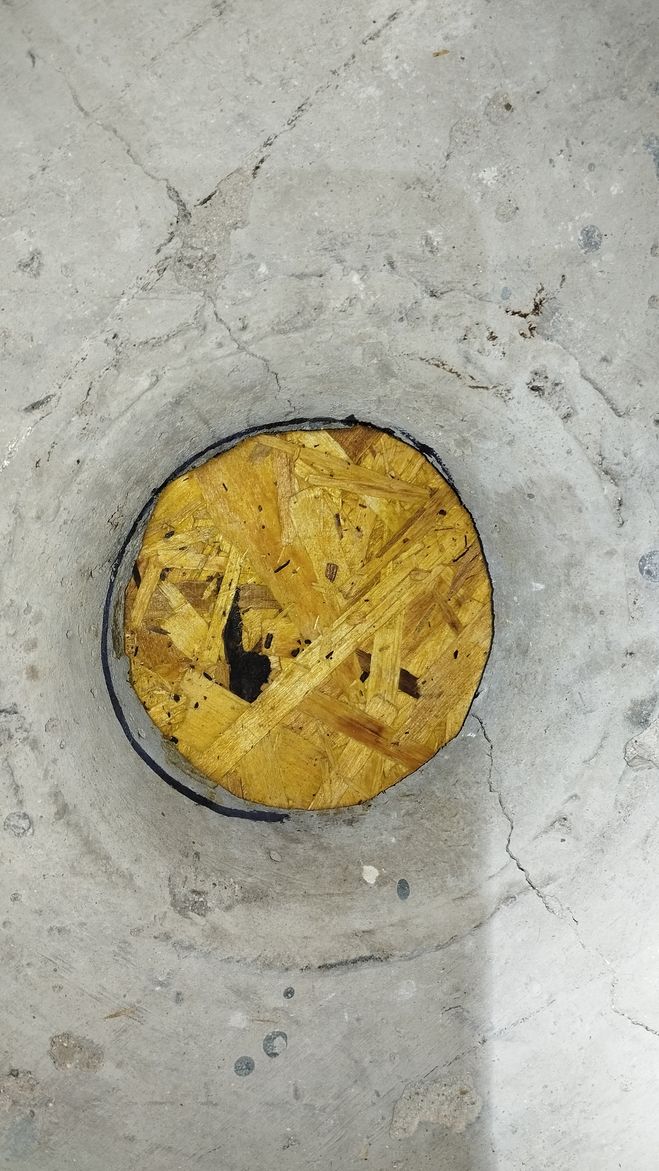 Затем берем кусок фанеры, по размеру больше отверстия, она будет "опалубкой", просверливаем в куске фанеры несколько отверстий, просовываем проволоку (мягкую) и выводим концы проволоки наружу со стороны Вашей квартиры (кусок фанеры со стороны соседей снизу).