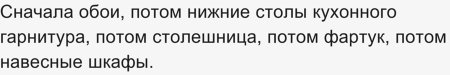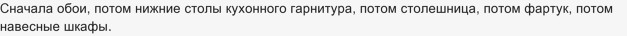 Далее отделочные работы связанные со стенами и в конце заносим и устанавливаем кухонную мебель.