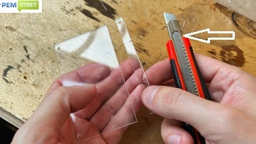 Вдоль металлической линейки по разметке проводим несколько линий ножом, кладем заготовку на край стола и резким, но уверенным движением, отламываем оргстекло, по линии реза.