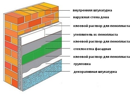 Если заранее планировалось, что стена утеплённая пенопластом будет штукатурится, то при установке (крепеже) пенопластовых плит под дюбеля зонтики, прижимающие пенопласт сразу раскатывается специальная сетка под штукатурку, бывает она металлическая и полимерная. Металлическая бывает из оцинкованного и черного и биметаллического металла, с разным диаметром ячейки и способа плетения, самая дешёвая эта которая методом штамповки и растяжения, а самая дорогая из биметалла плетёно сварная, а вот полимерные тоже бывают толстостенные практически как сетка для арок и до качеств тоненькой москитки, я бы порекомендовал металлическую, оцинкованную, плетённую сетку - она и притянется лучше и форму держать будет. Если сетку сразу не притянули, значит притягиваем крепежом (пробки и заморезы), я лично приклеиванием полимерной не доверяю, это не на долго, а вот прикрученная металлическая армировка это вещь. Штукатурку берём для фасадных работ, покупайте тёмную (по цвету напоминает церазит плиточный клей) в ней цемента больше, а гипсов меньше, она дольше постоит и штукатурим, ни чем эта манипуляция не отличается от обычного штукатурки, первый раз проходим и выравниваем поверхность, даём время подсохнуть (учтите что на пенопласте сохнет дольше чем на кирпичной стене, поэтому возможно придётся подождать и сутки!) а второй раз наносим слой примерно 5мм ровняя шпателем правилом и растирая доской для штукатурки. Когда высохнет и зажелезнеет раствор это примерно 3 дня можно красить.