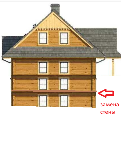 Предположим!! что сгнила та стена, которая справа, где есть окно и нет камина. Какое там внутри стен на углах сцепление? Неизвестно, но какое бы оно ни было, потребуется поднять то бревно, которое лежит на гнилом брусе. Поднять одно бревно не представляется возможным, поэтому придется поднимать и бревно и стену вместе с ним, а там выше еще и крыша. Возможно ли сделать такой подъем конструкции дома без того, чтобы все развалилось, съехало, покосилось? Без специальных кранов, подъемников, подпорок - невозможно.