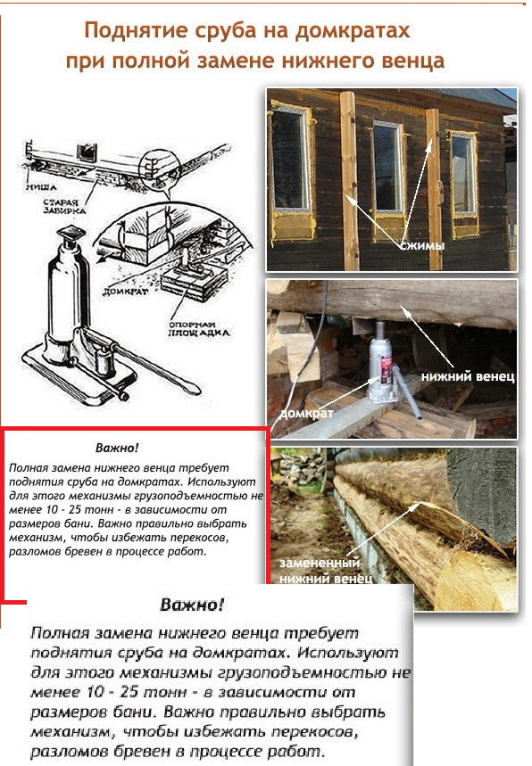 - Чтобы было меньше перекосов из-за усадки всей стены, можно заменить только нижние и верхние венцы, которые больше всего подвержены разрушению, а также частично сделать замену гнилых участков бревен вдоль стены.