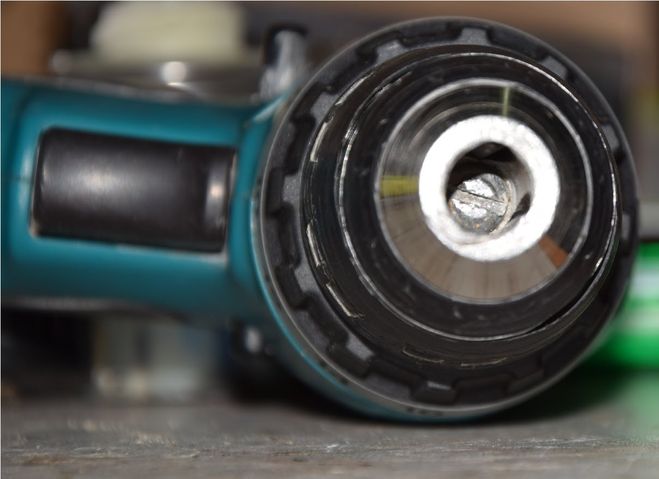 Если есть рядом прочный стол, или тиски, то рядом с ними держим тот самый зажатый ключ и включаем шуруповёрт на короткое время, ключ бьёт по верстаку, патрон откручивается.