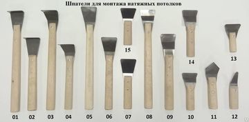 Для монтажа натяжных потолков используется специальный шпатель со стальным лезвием, к которому прикреплена изогнутая ручка. Благодаря такой форме ручки существенно облегчается и становится более удобным применение этого шпателя в креплении потолочных конструкций. Особенно удобно им закреплять края натяжных потолков.
