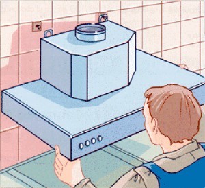 К брускам крепится вытяжка точно так же как к прямой стене без помех.