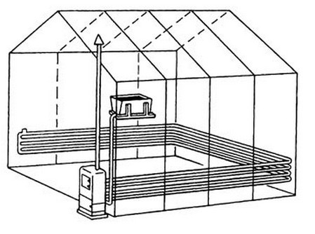 Но эти два варианта потребляют много электроэнергии, лучше всего соорудить водяное отопление, работающее от печи на твёрдом или жидком топливе, разместив трубы по контуру теплицы