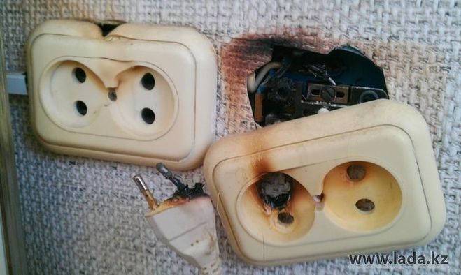 При выходе из строя одной из розеток, чаще всего подгорают и ослабляются провода контактов. Это можно легко определить по изменению формы и цвета проводов изоляции или элементов розетки, в виду сильного нагрева. Иногда мы можем видеть даже вот такую картину -