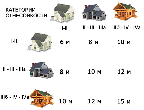 К примеру между деревянными домами должно быть расстояние не менее 10-и метров (надо ещё и категорию огнестойкости учитывать)