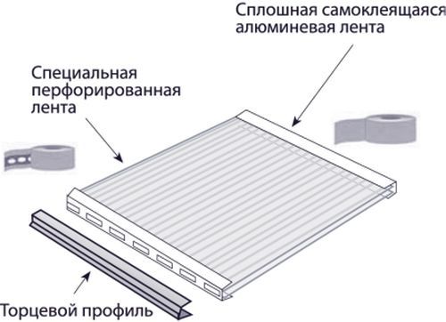 Герметизирующая лента защитит верхнюю часть листов поликарбоната, от попадания влаги, а вот перфорированная лента защищает нижнюю часть поликарбоната.
