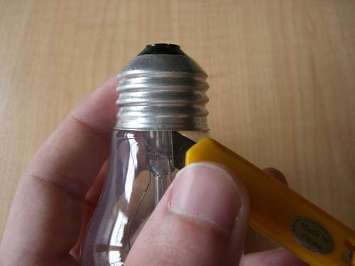Обычно цоколь прикрепляется к стеклянной колбе специальным клеем. Со временем клей начинает крошиться, так что если лампочка старая, то при небольшом усилии при проворачивании цоколя он начинает крутиться и легко отрывается. Если же этого не происходит, то не стоит отчаиваться, можно попробовать ещё один способ. Взять тонкую отвёртку или же прочный нож и аккуратно отогнуть небольшой участок цоколя в месте соединения его с колбой. Далее паастижами подхватить отогнутую часть и оторвать полоску цоколя. Далее всё просто, крошим оставшийся клей и снимаем остатки цоколя. Важно помнить при этой работе о технике безопасности, ведь работа производится со стеклом, а оно имеет свойство нет нет да и разбиться.
