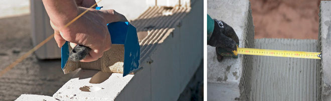 В самом начале работ нужно класть гидроизоляцию. Она укладывается на цементно-песчаный раствор. А он в свою очередь кладется на фундамент. Дальше уже слой раствора наносится непосредственно на гидроизоляционный материал. Итак, начинаем выкладывать первый ряд блоков. Как правило, соотношение смеси цемент/песок применяем 1 к 3. Кстати, первый ряд блоков укладывается на более толстый слой раствора, потому что именно первым рядом выравниваем горизонталь. Но здесь надо учесть, что толщина шва не должна превышать 10-20мм., так как один сантиметр раствора увеличивает теплопроводность на 20-30%, а это приводит к значительным потерям тепла. В связи с этим, лучше воспользоваться специальным клеем. С его помощью толщину шва можно сделать меньше, а приводит к экономии тепла. является фундаментом, основой, для постройки всей стены.