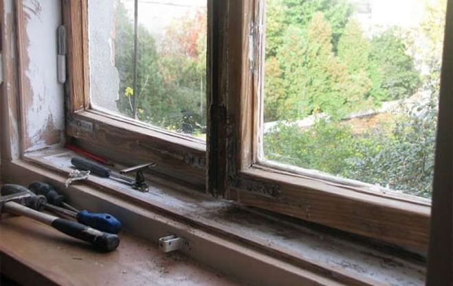 Первым делом выполняется демонтаж деревянных рам из оконной коробки. После чего из рам удаляются старые штапики или уплотнители, снимается фурнитура (ручки, шпингалеты) и вытаскиваются стекла.