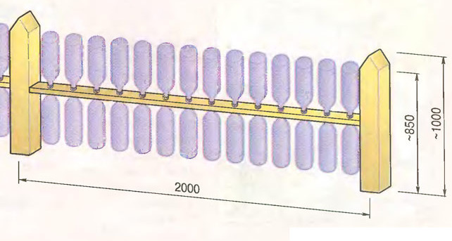 Можно сделать забор, где пластиковые бутылки будут располагаться как в горизонтальном, так и в вертикальном положении. Например, по верху и по низу забора можно пустить ряды с горизонтальным расположением, а весь центр будет состоять из вертикально закрепленных бутылок. Причем можно верхний и нижний окантовочные ряды сделать из бутылок другого цвета. Смотреться такой забор будет весьма и весьма оригинально.