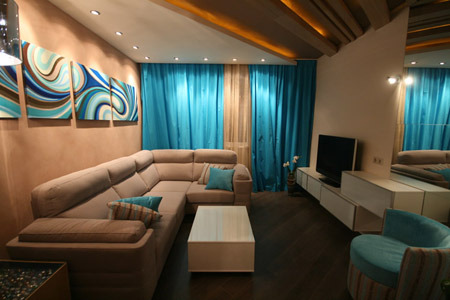 Очень красиво сочетается бирюзовый и шоколадный оттенок, таким дополнением в интерьере могут быть как занавески, так и обивка мебели.