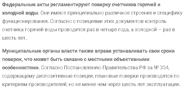 В каждом регионе время поверки счётчиков разное, я читал что у одних это раз в четыре года счётчик холодной воды и раз в шесть лет горячей. В моём регионе поверяют раз в пять лет, сразу оба счётчика. На время поверки водоснабжение запускается по временной схеме и человек платит, за воду, по расценкам ЖКХ.