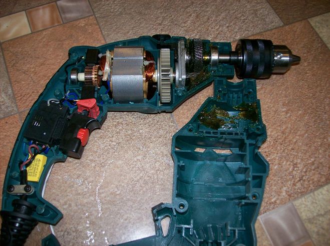 До кнопки добраться не проблема, на корпусе дрели находятся шурупы, обычно в потае, вот их откручиваем, затем раздвигаем две половинки дрели, кнопку прекрасно видно, к ней есть доступ.